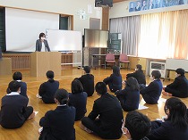 10月26日(月)に2回目の職業講話がありました。今回は、来年、常盤地区に完成予定の「サントリー天然水 北アルプス信濃の森工場」の澤田元充さんと、石塚昭臣さんにおいでいただき、「水と生きる サントリーの企業理念とその原動力とは」と題してお話しいただきました。